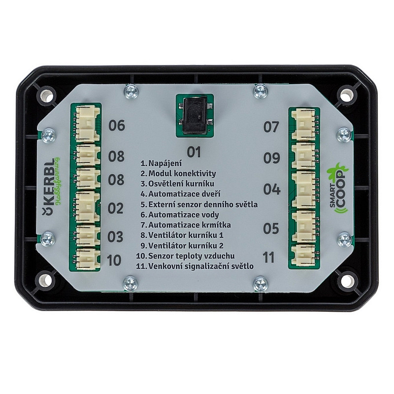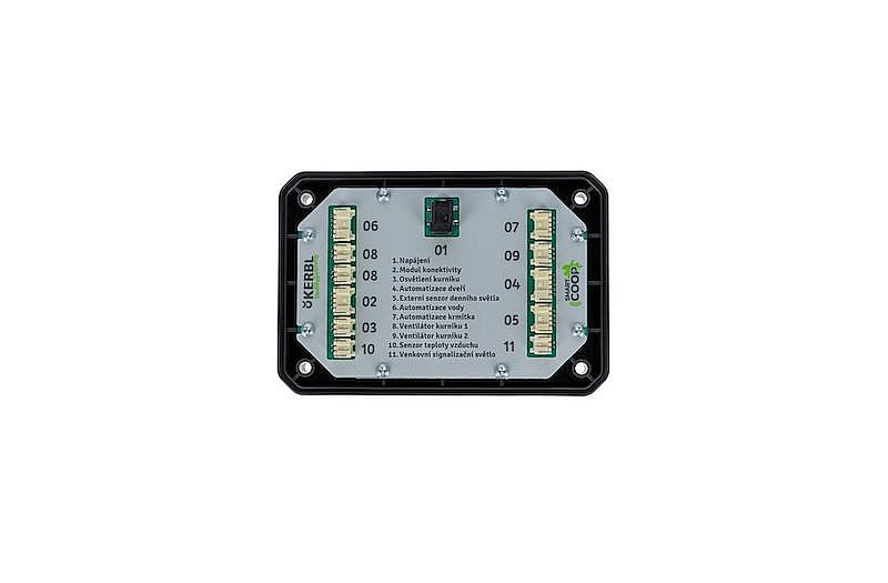 Ovládací panel k chytrému kurníku KERBL SmartCoop. Lze do něj zapojit všechny volitelné jednotky, jako je například otevírání dvířek, čidlo teploty, senzor světla apod.