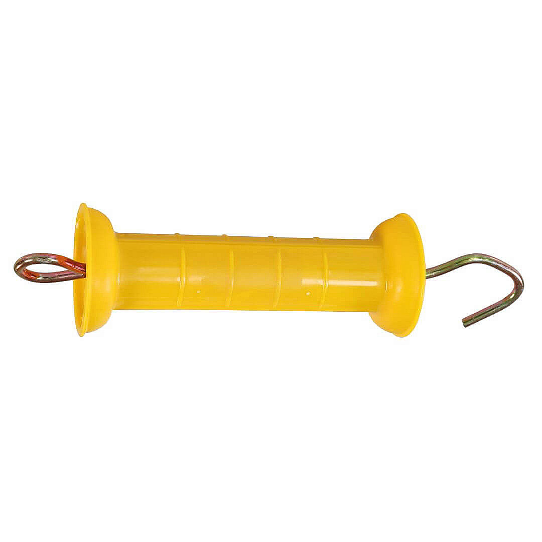 Plastová bránová rukojeť určená ke vchodům pro elektrické ohradníky. Držák má háček pro uchycení k bránovému izolátoru a zabudovanou pružinu pro napnutí vodiče. Barva žlutá.