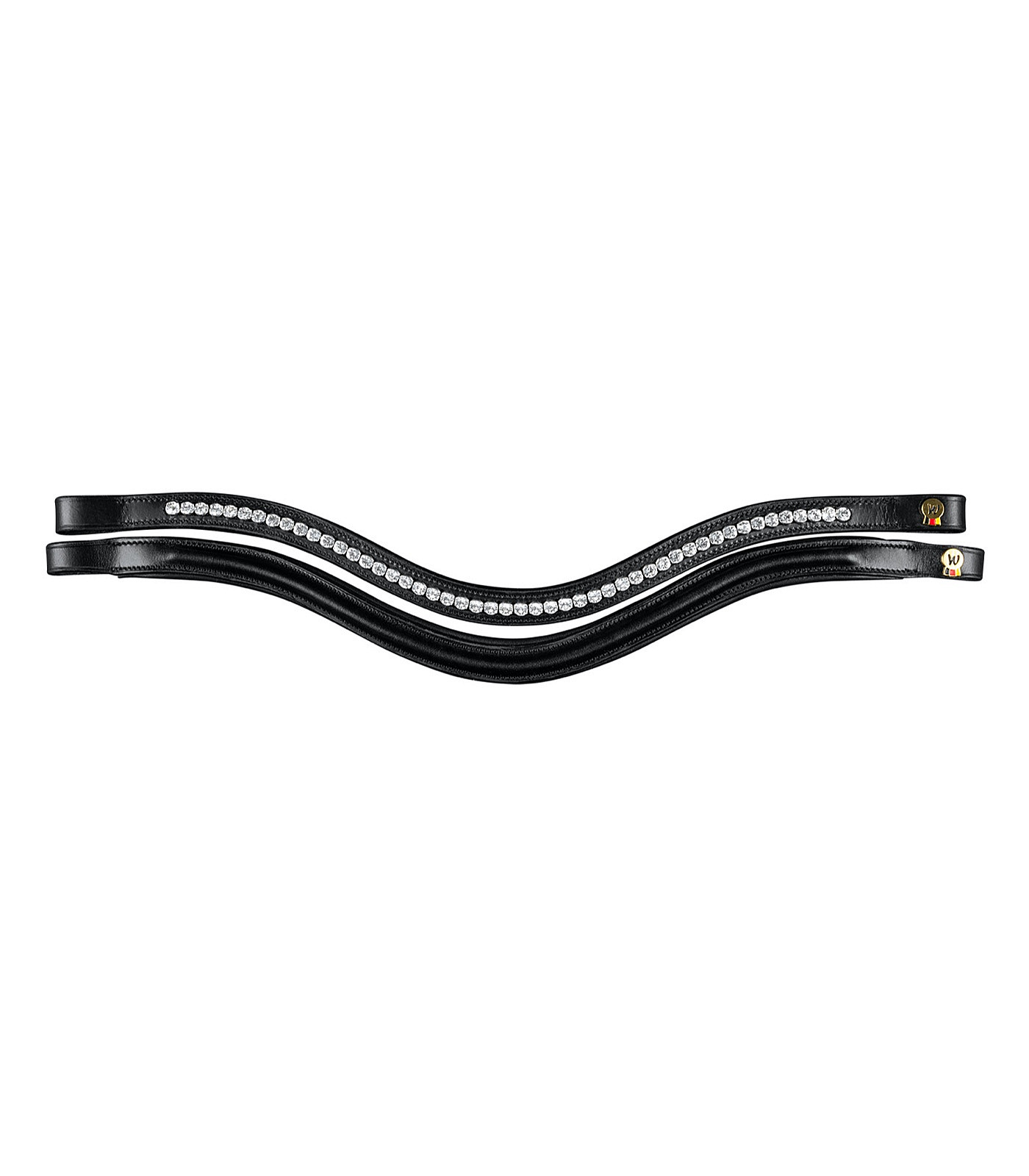 Luxusní kožená uzdečka QHP Selene opatřená švédským nánosníkem. Široký anatomicky tvarovaný nánosník jí dodává velmi luxusní vzhled. Čelenka je osazena velkými černými kamínky. Barva černá.