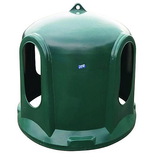 Plastový krmelec pro koně ve tvaru zvonu určený pro zakrytí balíku při přikrmování zvířat na pastvině nebo ve výběhu