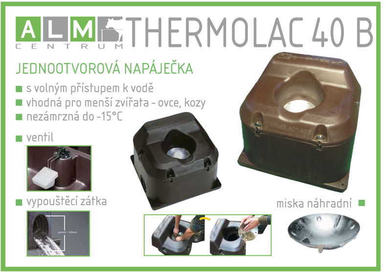 Misková napáječka Thermolac 40B od francouzského výrobce La Buvette je určená pro skot, koně, ale také pro menší zvířata jako jsou ovce a kozy. Má jeden otvor, lze ji použít po celý rok venku i vevnitř. Napáječka obslouží 15 ks skotu nebo koní a 30 ovcí či koz. Nezámrzná do -15° C.