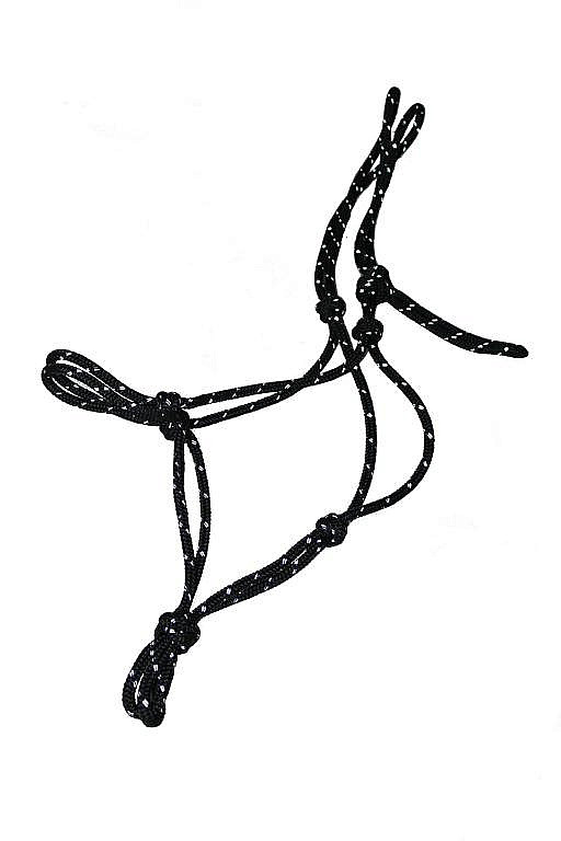 Reflexní provazová ohlávka pro koně, vhodná jako doplněk pro pohyb na silnici za tmy. Jedná se o klasickou provazovou ohlávku s jádrem, je tudíž pevnější a nevytahuje se. Barva černá protkaná reflexním páskem.