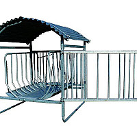 Žárově zinkovaný krmelec pro ovce s pohyblivým košem, pomocí kterého lze zajistit optimální přístup zvířat ke krmivu, vhodný pro balíky do cca 140 cm.