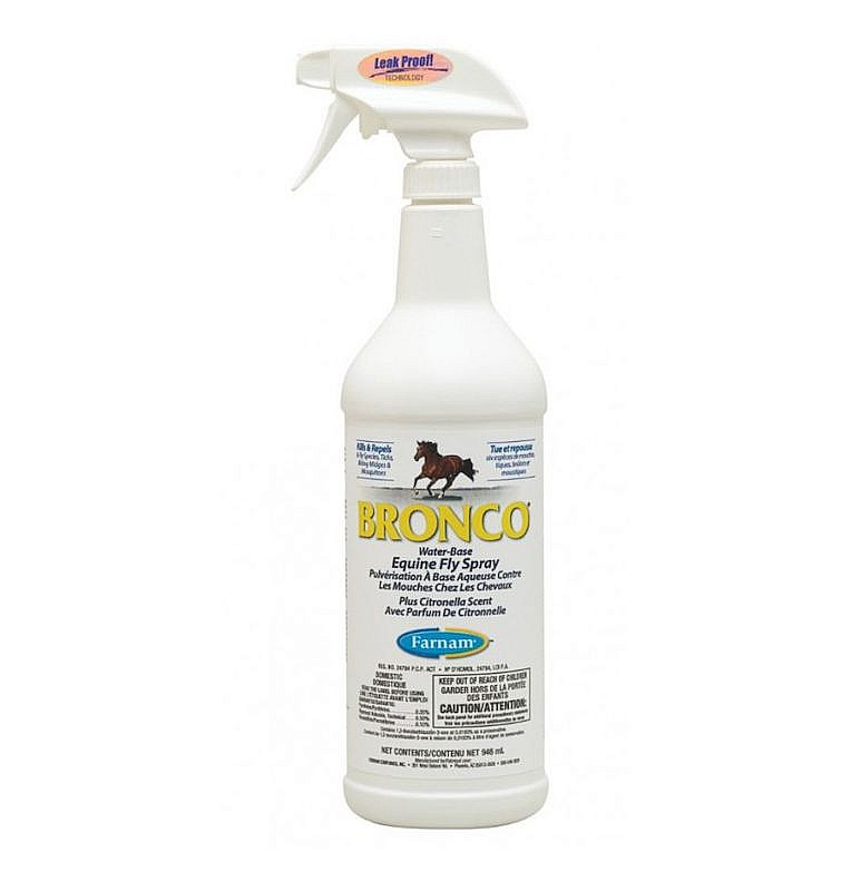 Spolehlivý repelent Farnam Bronco účinně odpuzuje mouchy, komáry a jiný dotěrný hmyz. Lze použít na koně či do prostředí stáje. Lehká vodní formule s vůní citronelly. Balení 946 ml.