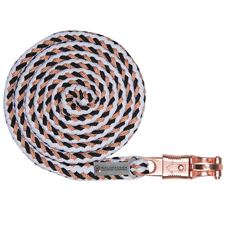 Vodítko pro koně Waldhausen Rosé Shine o délce 2 m. Opatřené bezpečnostní panik karabinou. K dostání v černo-bílo-růžové barvě.