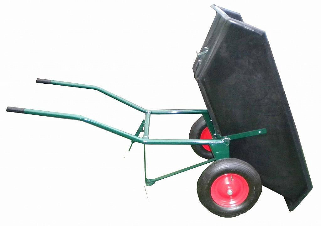 Dvoukolový výklopný vozík s plastovou korbou o objemu 500 l v zelené barvě. Konstrukce je žárově zinkovaná proti korozi, plastová korba je ideální na převážení slámy, sena, či hnoje.