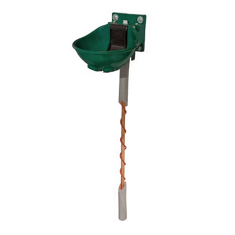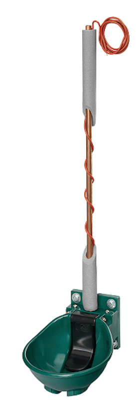 Na spodní straně napáječky je umístěn vyhřívací kabel o výkonu 33 W s integrovaným termostatem, který automaticky reguluje ohřev vody. Spíná se pokud teplota klesne na cca 5°C a vypne se při teplotě 15°C. Součástí jsou také další 2 metry topného kabelu (21 W) pro vyhřívání přívodního potrubí.