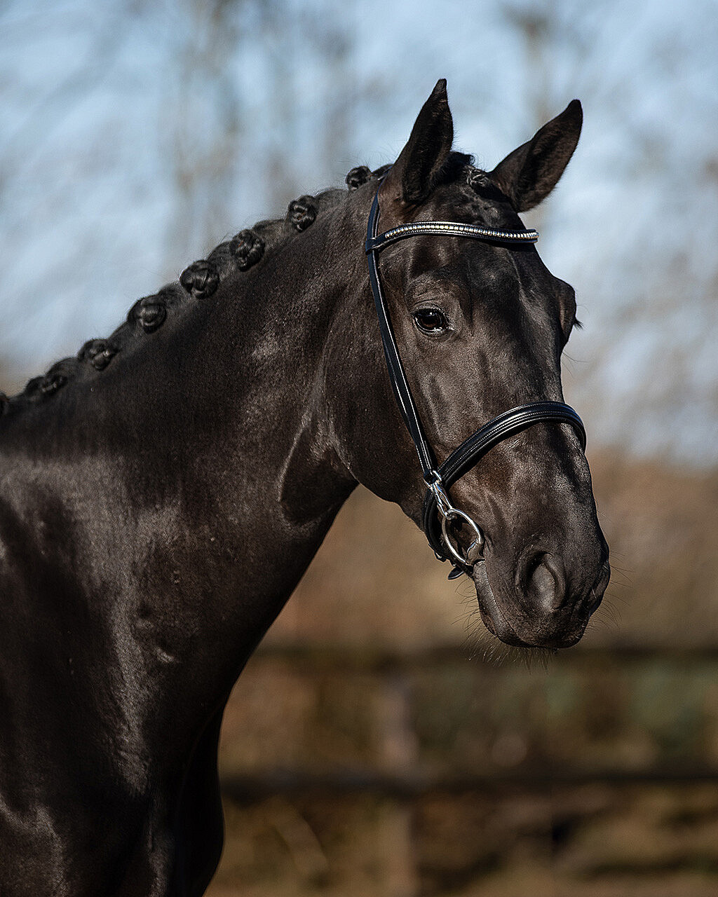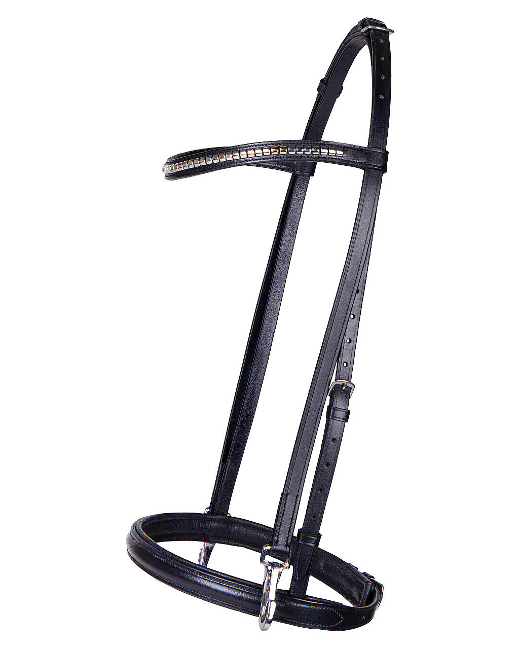 Luxusní kožená uzdečka QHP Selene opatřená švédským nánosníkem. Široký anatomicky tvarovaný nánosník jí dodává velmi luxusní vzhled. Čelenka je osazena velkými černými kamínky. Barva černá.